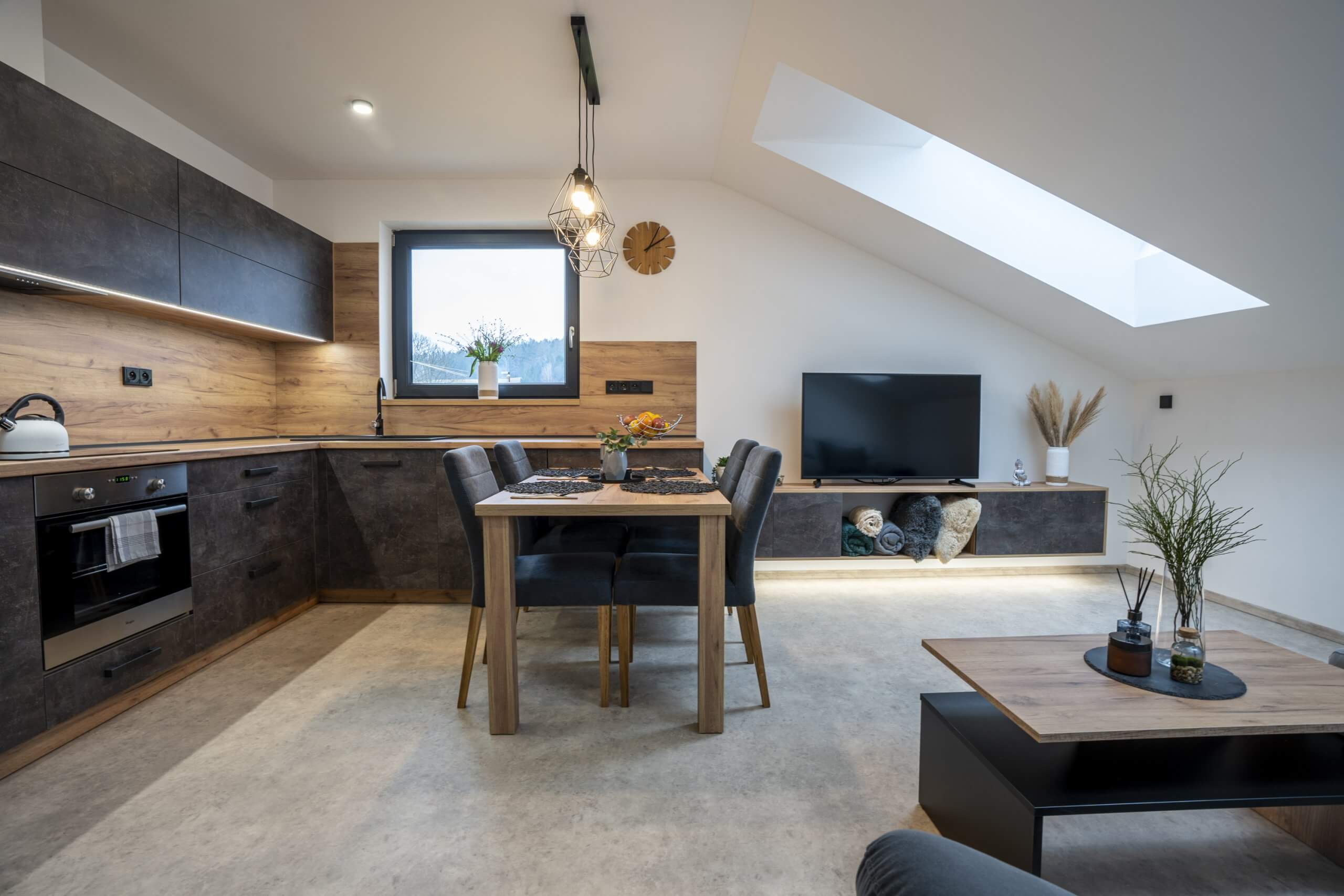 Romantická dovolená jen v páru? V apartmánu Běla vám bude skvěle. Maximální kapacita pro 4 osoby zajistí dostatek místa a přesto příjemné soukromí a útulno. K dispozici je ložnice s prostornou manželkou postelí z masivu, obývací pokoj s kompletně vybavenou kuchyní a koupelna se sprchovým koutem. Pokud si pobyt neumíte… zobrazit více představit bez dětí, je v obývacím pokoji nachystaná rozkládací pohovka. V apartmánu je televize s více než 150 kanály a Netflixem. Romantiku a příjemnou relaxaci podtrhuje ambientní podsvícení nábytku. Apartmán je kompletně zařízený. Stačí si přivézt jen své nejmilejší věci a užít si příjemného prostředí.